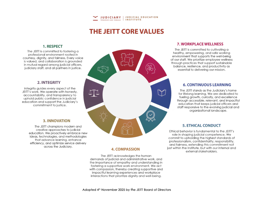 Continuous judicial education is essential for the Judiciary to fulfil its mandate to the public and its stakeholders to deliver justice in an effective and efficient manner, while sustaining public trust and confidence. It is out of this necessity that the Judicial Education Institute of Trinidad and Tobago (JEITT) was created – a distinct but integral part of the Judiciary, committed to the establishment’s core objective: the administration and achievement of justice.